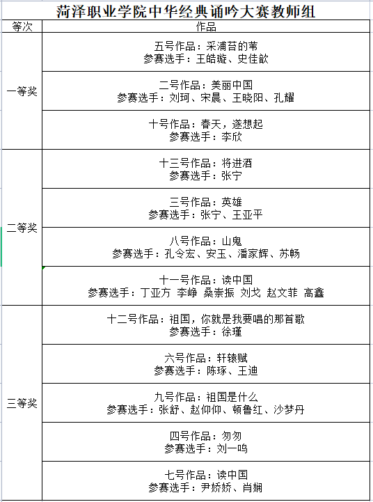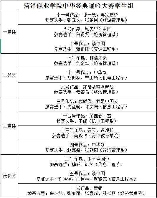 全校共有27个作品参赛,比赛分为教师组和大学生组。经过紧张激烈的角逐,作品《采浦苔的苇》《美丽中国》《春天,遂想起》获教师组一等奖,《将进酒》《轩辕赋》等作品分获教师组二、三等奖;作品《那一晚,再别康桥》等获大学生组一等奖,《相信未来》《我骄傲,我是中国人》《少年中国说》分获大学生组二、三等奖、优秀奖。