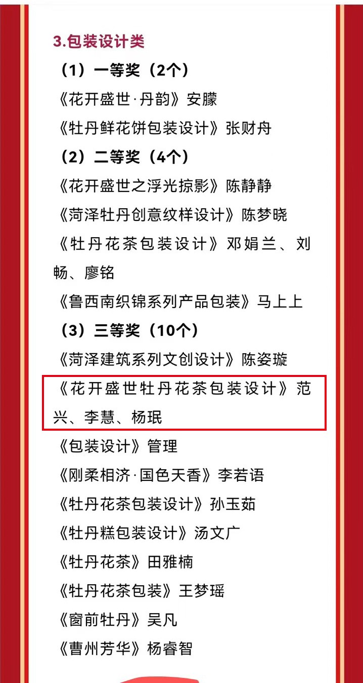 今年“花开盛世”牡丹系列奖项评选活动,设置了牡丹文化艺术类、产业发展、文创作品类等8大奖项,共收到来自新加坡、日本、马来西亚等多个国家,以及全国31个省市自治区和港澳台地区参赛作品近4万件。整个赛项活动名家荟萃,名品云集,其中范兴、李慧、杨珉制作的《花开盛世牡丹花茶包装设计》充分融入牡丹形象,以精美的包装设计,塑造本土化品牌形象,实现产业融合发展,在众多作品中脱颖而出。