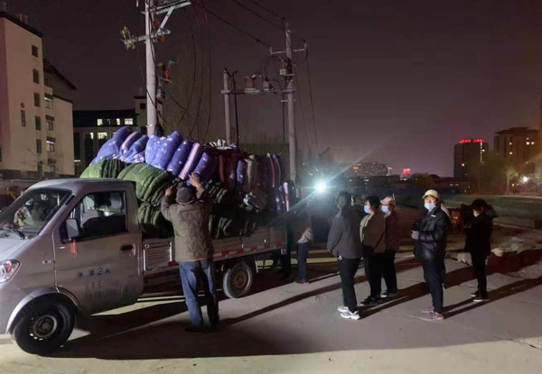 图2. 紧急筹集被褥500套、雨衣、雨伞以及棉大衣各200套 后勤管理处第一时间在校内寻找场地并按照物资存放要求进行改造,设置物资存放储备库。与大宗食品统一配送供应商协商,通过签订协议,让食材供应商在校内囤积米、面、粮油等生活物资,确保师生校内生活物资储备供应充足。