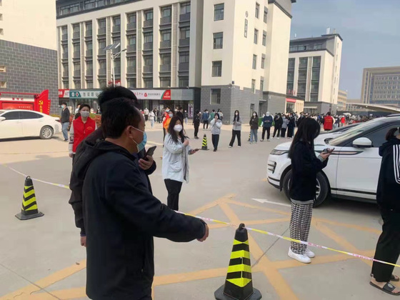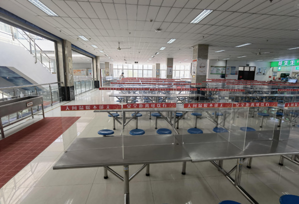 图9. 核酸检测现场秩序维护 为向师生提供安全、便捷就餐保障,减少人员聚集,实行错峰就餐,严格控制每时段就餐人数,并在餐桌加装玻璃挡板。为办公封闭区的教职工提供餐盒份饭,严格配餐、配送各环节管理,以高质量的餐饮服务水平,为打赢疫情防控阻击战提供有力保障。