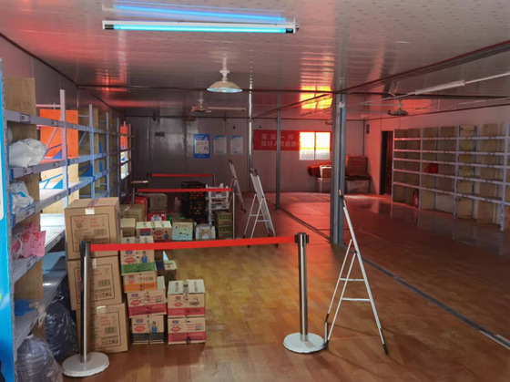 图4-6. 建立防疫物资及食材供应中转站 后勤管理处组织消杀消毒及保洁人员按照卫生消毒管理标准进行严格操作,对校园所有办公楼、教学楼、公寓楼、食堂等建筑内外和公共场所、道路无死角消杀消毒和卫生保洁,确保为在校师生提供安全、舒适的学习生活环境。