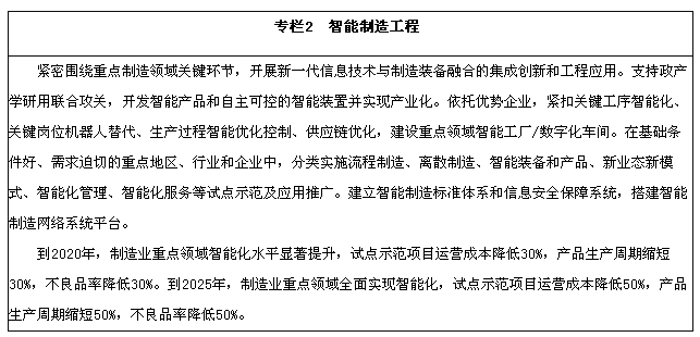 2020年,基本实现工业化,制造业大国地位进一步巩固,制造业信息化水平大幅提升。掌握一批重点领域关键核心技术,优势领域竞争力进一步增强,产品质量有较大提高。制造业数字化、网络化、智能化取得明显进展。重点行业单位工业增加值能耗、物耗及污染物排放明显下降。