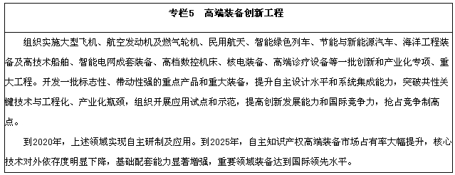 航空装备。加快大型飞机研制,适时启动宽体客机研制,鼓励国际合作研制重型直升机;推进干支线飞机、直升机、无人机和通用飞机产业化。突破高推重比、先进涡桨(轴)发动机及大涵道比涡扇发动机技术,建立发动机自主发展工业体系。开发先进机载设备及系统,形成自主完整的航空产业链。