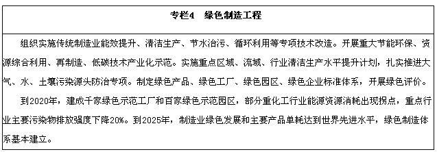 加大先进节能环保技术、工艺和装备的研发力度,加快制造业绿色改造升级;积极推行低碳化、循环化和集约化,提高制造业资源利用效率;强化产品全生命周期绿色管理,努力构建高效、清洁、低碳、循环的绿色制造体系。