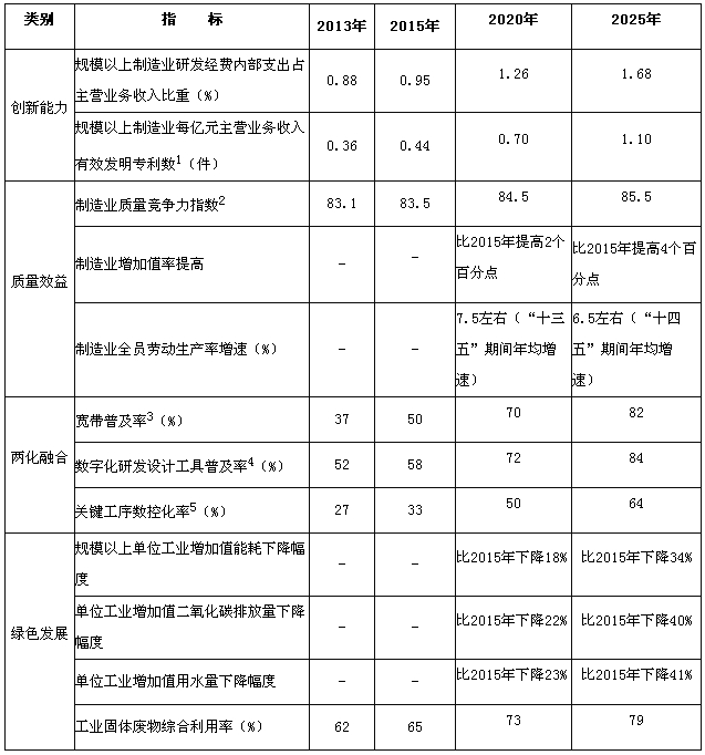 2025年,制造业整体素质大幅提升,创新能力显著增强,全员劳动生产率明显提高,两化(工业化和信息化)融合迈上新台阶。重点行业单位工业增加值能耗、物耗及污染物排放达到世界先进水平。形成一批具有较强国际竞争力的跨国公司和产业集群,在全球产业分工和价值链中的地位明显提升。